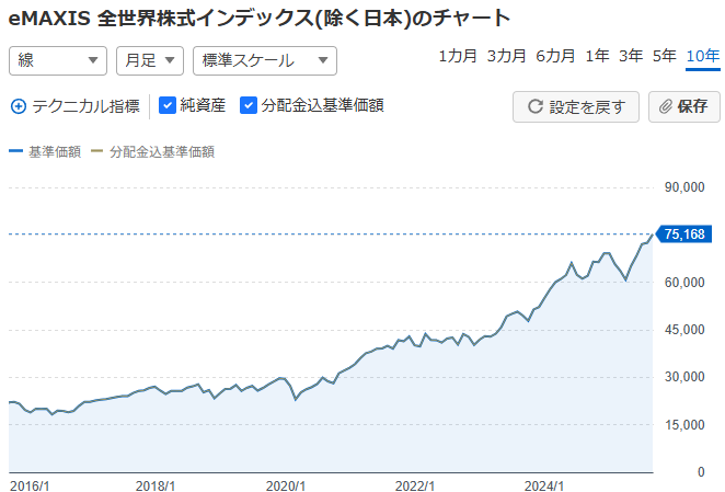 最後に、私が投資を始めた後押しとなったのは全世界インデックスのチャートになります。